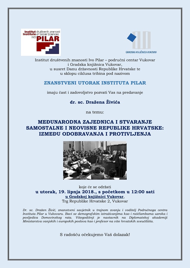 Institut društvenih znanosti Ivo Pilar – Područni centar Vukovar i Gradska knjižnica Vukovar, ususret Danu državnosti Republike Hrvatske te u sklopu ciklusa tribina pod nazivom ZNANSTVENI UTORAK INSTITUTA PILAR pozivaju na predavanje dr. sc. Dražena Živića na temu MEĐUNARODNA ZAJEDNICA I STVARANJE SAMOSTALNE I NEOVISNE REPUBLIKE HRVATSKE: IZMEĐU ODOBRAVANJA I PROTIVLJENJA koje će se održati u utorak, 19. lipnja 2018., s početkom u 12 sati u Gradskoj knjižnici Vukovar, Trg Republike Hrvatske 2, Vukovar. – Pozivnica