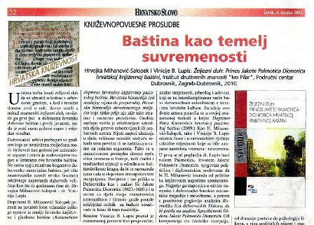 – Baština kao temelj suvremenosti, Hrvatsko slovo, 4. ožujka 2011., str. 22.