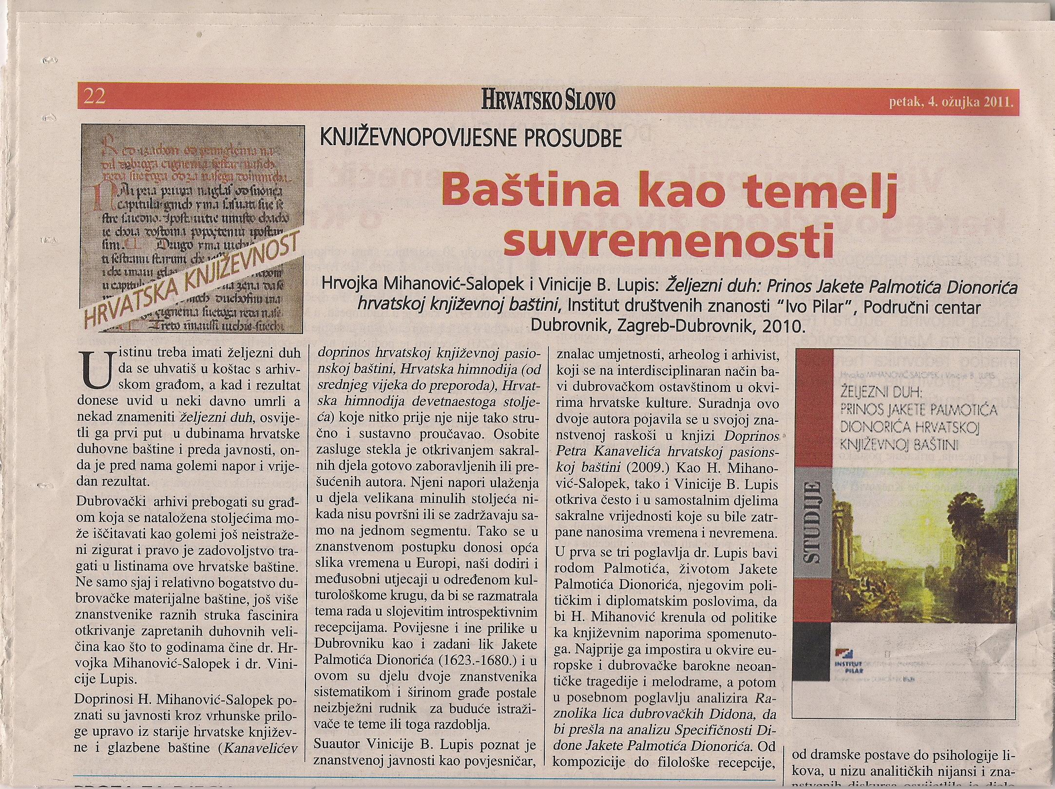 Tjednik za kulturu Hrvatsko slovo u broju od 5. ožujka 2011. pod naslovom “Baština kao temelj suvremenosti” donosi osvrt na knjigu Hrvojke Mihanović-Salopek i Vinicija B. Lupisa Željezni duh: Prinos Jakete Palmotića Dionorića hrvatskoj književnoj baštini objavljenu u izdanju Instituta društvenih znanosti Ivo Pilar – Područni centar Dubrovnik (Biblioteka Studije, knj. 13)