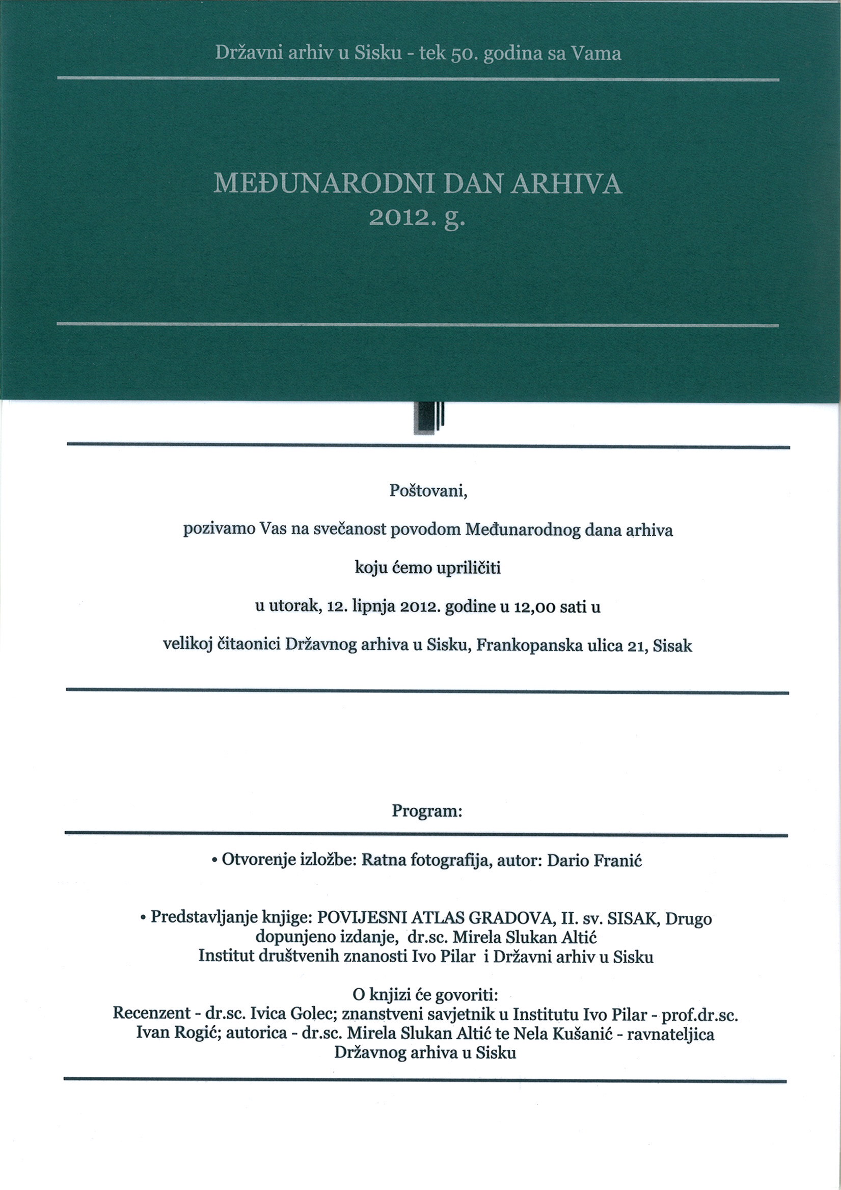 U izdanju Instituta društvenih znanosti Ivo Pilar i Državnog arhiva u Sisku iz tiska je svibnja 2012. godine izašlo drugo dopunjeno izdanje 2. sveska Povijesnog atlasa gradova autorice dr. sc. Mirele Slukan Altić posvećenog gradu Sisku. Predstavljanje knjige održat će se 12. lipnja 2012. u Državnom arhivu u Sisku a o knjizi će govoriti prof. dr. sc. Ivica Golec, prof. dr. sc. Ivan Rogić, Nela Kušanić – ravnateljica Državnog arhiva u Sisku te autorica dr. sc. Mirela Slukan Altić. – Pozivnica