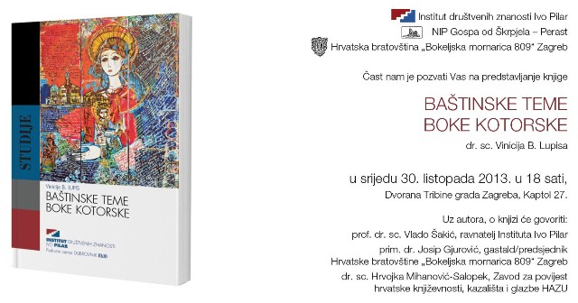 U organizaciji Instituta društvenih znanosti Ivo Pilar, NIP Gospa od Škrpjela – Perast i Hrvatske bratovštine “Bokeljska mornarica 809” Zagreb predstavljena je 30. listopada 2013. u Dvorani Tribine grada Zagreba na Kaptolu knjiga dr. sc. Vinicija B. Lupisa BAŠTINSKE TEME BOKE KOTORSKE. Uz autora, o knjizi su govorili: prof. dr. sc. Vlado Šakić, ravnatelj Instituta Ivo Pilar, prim. dr. Josip Gjurović, gastald/predsjednik Hrvatske bratovštine “Bokeljska mornarica 809” Zagreb i dr. sc. Hrvojka Mihanović-Salopek, recenzentica knjige iz Zavoda za povijest hrvatske književnosti, kazališta i glazbe HAZU