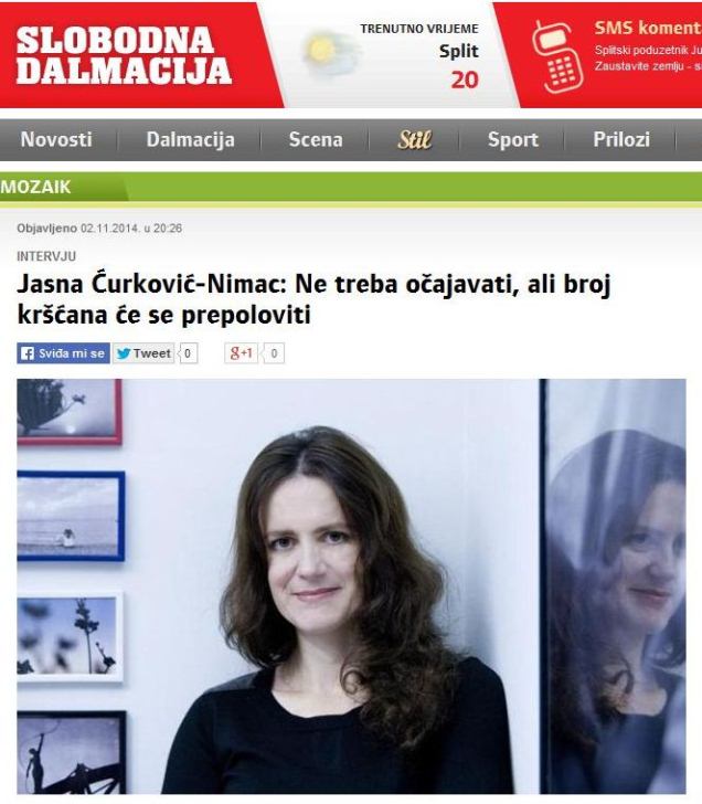 Slobodana Dalmacija u broju od 2. studenoga 2014. donosi razgovor Marijane Cvrtile sa znastvenom suradnicom Instituta Ivo Pilar dr. sc. Jasnom Ćurković-Nimac pod naslovom Ne treba očajavati, ali broj kršćana će se prepoloviti