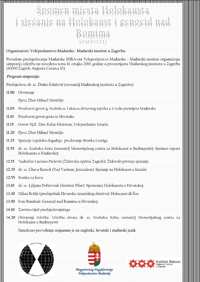 U petak 11. ožujka 2016. na simpoziju “Spomen-mjesta Holokausta i sjećanje na Holokaust i genocid nad Romima” koji organiziraju Veleposlanstvo Mađarske – Mađarski institut u sklopu predsjedavanja Mađarske IHRA-om (Međunarodni savez za sjećanje na Holokaust) dr. sc. Ljiljana Dobrovšak održat će predavanje na temu Spomenici Holokausta u Hrvatskoj. U sklopu simpozija organizira se i izložba. – Program simpozija