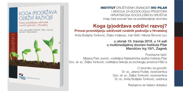 Institut društvenih znanosti Ivo Pilar i Sekcija za sociologiju prostora Hrvatskoga sociološkog društva pozivaju na predstavljanje zbornika Koga (p)održava održivi razvoj? Prinosi promišljanju održivosti ruralnih područja u Hrvatskoj u utorak 10. travnja 2018. u 14 sati u Multimedijalnoj dvorani Instituta Pilar, Zagreb, Marulićev trg 19/1. – Pozivnica