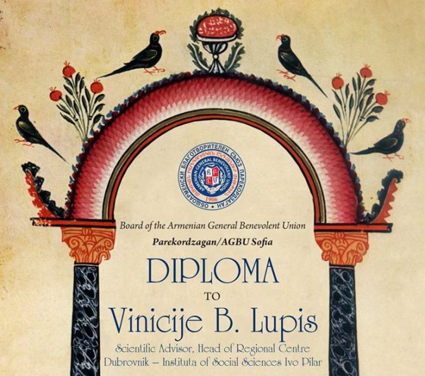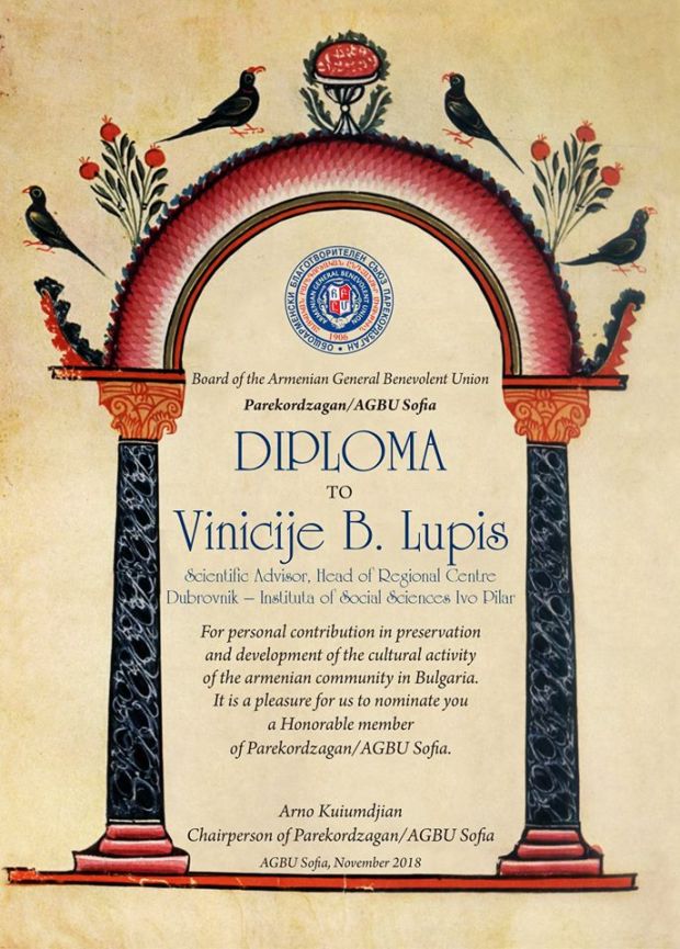 Na poziv Armenian General Benevolent Union (AGBU), Sofija, dr. sc. Vinicije B. Lupis održao je u Armenskom domu predavanje naslovljeno “Armenske uspomene”. Predsjednik AGBU-a Arno Kuiumdjian i počasna predsjednica AGBU-a u znak zahvalnosti za znanstveni prilog istraživanju armenske kulture i baštine primili su dr. Lupisa u počasno članstvo AGBU-a Sofija. Osobitim poštovanjem primanja u počasno članstvo armenske krovne udruge dr. sc. Vinicija B. Lupisa iskazana je zahvala Armenaca Bugarske za njegov znanstveni rad na istraživanju armenske sakralne baštine u Bugarskoj. − Diploma
