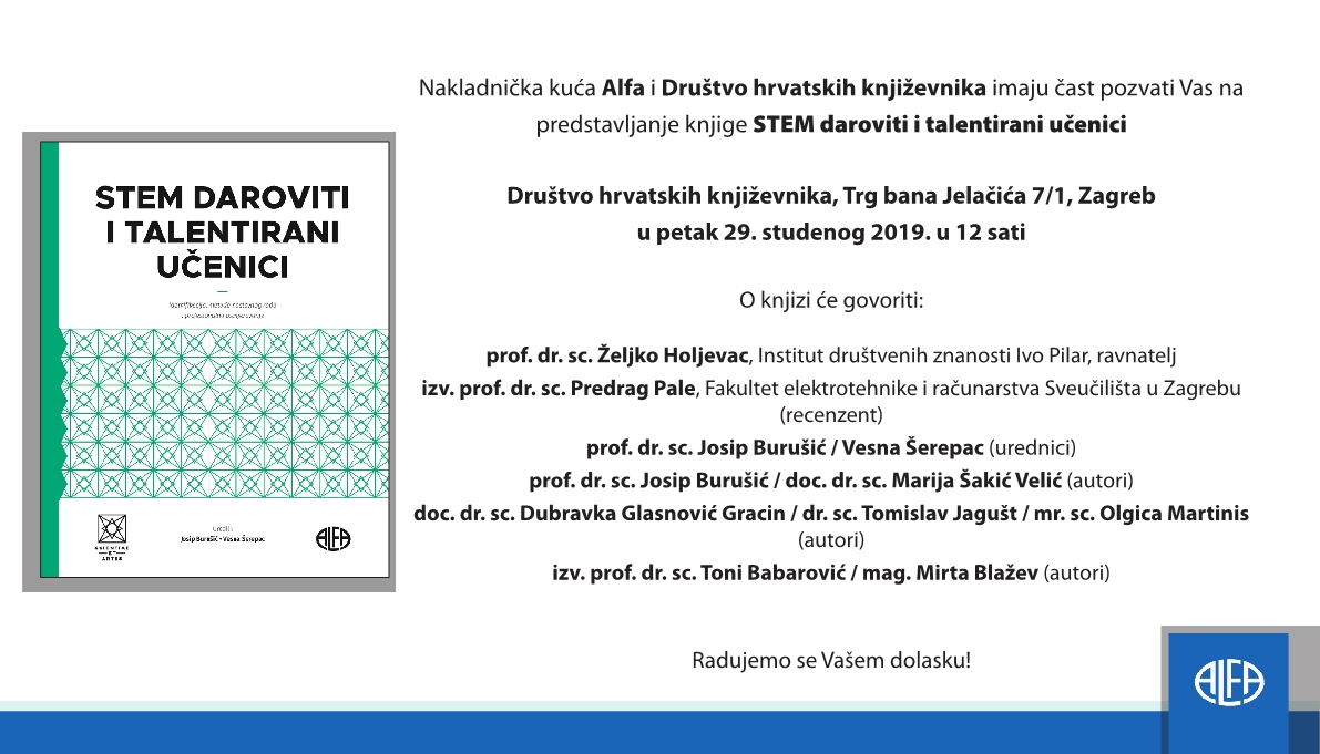 Nakladnička kuća Alfa i Društvo hrvatskih književnika organizirali su predstavljanje knjige STEM DAROVITI I TALENTIRANI UČENICI koje se održalo 29. studenog 2019. u Društvu hrvatskih književnika, Trg bana Jelačića 7/1, Zagreb. − Pozivnica
