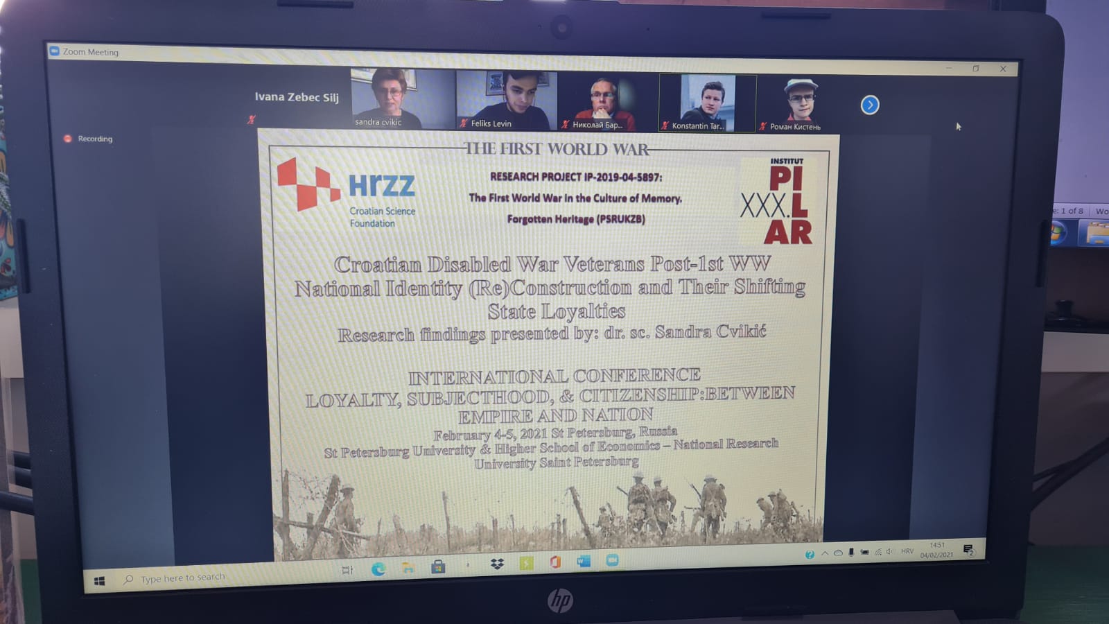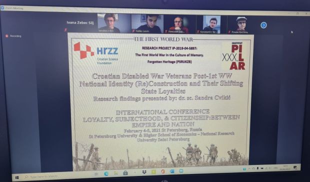 Dr. sc. Ivana Žebec Šilj and dr. sc. Sandra Cvikić have participated in on-line International Conference Loyalty, Subjecthood, & Citizenship: Between Empire & Nation on February 4 – 5, 2021 organized by the St Petersburg University and Higher Scholl of Economics – National Research University Saint Petersburg, in St Petersburg, Russia. Presented papers include preliminary research findings of the Research Project: The First World War in the Culture of Memory. Forgotten Heritage (2020-2023) financed by the Croatian Science Foundation. Related research subjects were presented under two titles: Loyal Soldiers – Disloyal Citizens? Croatian First World War Veterans During the Decade after the Great War by dr. sc. Ivana Žebec Šilj, and (Re)Construction of National Identity of Post-First World War Croatian Disabled Veterans and their Shifting Loyalties by dr. sc. Sandra Cvikić.