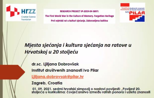 U organizaciji Agencije za odgoj i obrazovanje od 1. do 3. rujna 2021. godine održan je u online okruženju državni stručno-znanstveni skup za učitelje i nastavnike povijesti u osnovnim i srednjim školama u Republici Hrvatskoj na kojem je dr. sc. Ljiljana Dobrovšak sudjelovala pozvanim predavanjem i prezentacijom na temu “Mjesta sjećanja i kultura sjećanja na ratove u Hrvatskoj u 20. stoljeću”