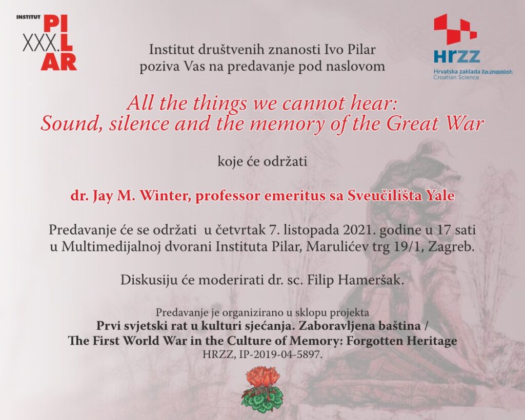 Institut društvenih znanosti Ivo Pilar organizirao je predavanje All the things we cannot hear: Sound, silence and the memory of the Great War koje je 7. listopada 2021. održao dr. Jay M. Winter, professor emeritus sa Sveučilišta Yale. Diskusiju je moderirao dr. sc. Filip Hameršak