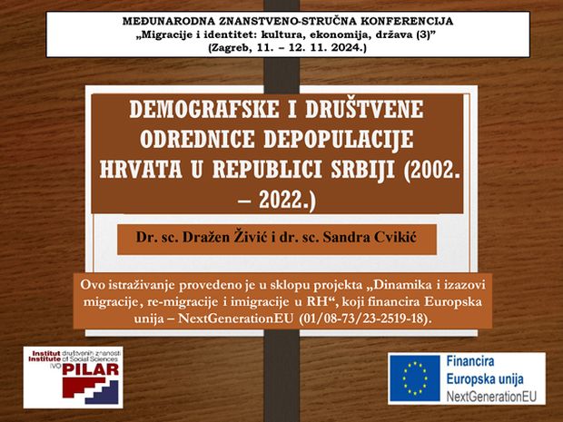Dr. sc. Sandra Cvikić sudjelovala je na Međunarodnoj znanstveno-stručnoj konferenciji „Migracije i identitet: kultura, ekonomija, država (3)“ u Zagrebu, 11.–12. 11. 2024. godine koju je organizirao Instituta za istraživanje migracija u prigodi proslave 40 godišnjice njegova osnutka. U okviru znanstvenog panela Suvremeni migracijski trendovi, izložila je rad u suautorstvu s dr. sc. Draženom Živićem pod naslovom Demografske i društvene odrednice depopulacije Hrvata u Republici Srbiji (2002.–2022.). Rad se temeljio na istraživanju provedenom u sklopu projekta Dinamika i izazovi migracije, re-migracije i imigracije u RH (DinamiRH) kojega financira Europska unija – NextGeneration EU (01/08-73/23-2519-18)