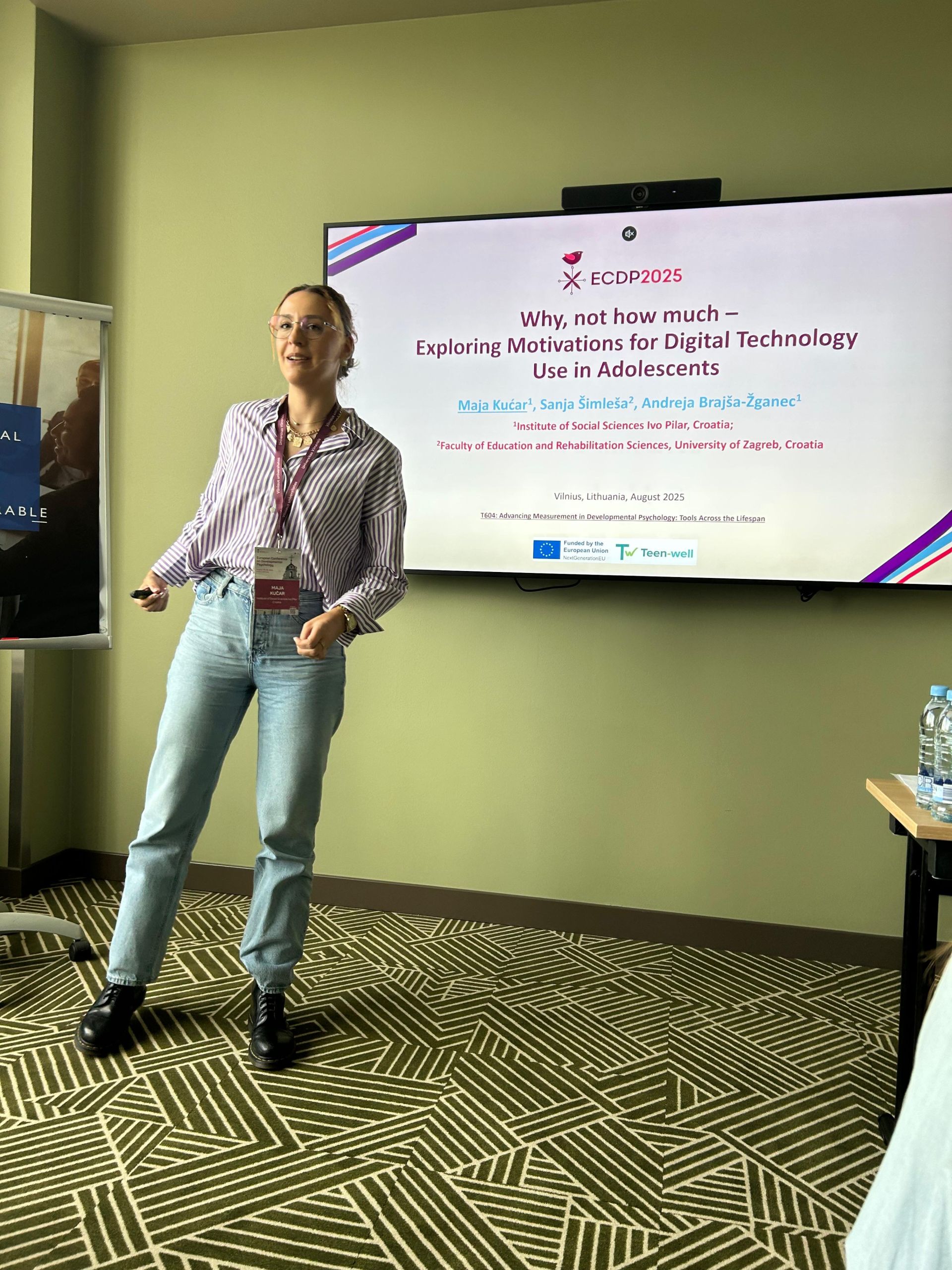 Maja Kućar održala je izlaganje pod nazivom „Why, not how much – Exploring Motivations for Digital Technology Use in Adolescents“ (Zašto, ne koliko – motivacija za korištenje digitalne tehnologije u adolescenciji) u sklopu sekcije usmjerene na psihometrijske alate u razvojnoj psihologiji. Rad je nastao u suautorstvu s dr. sc. Sanjom Šimleša i dr. sc. Andrejom Brajša-Žganec.
