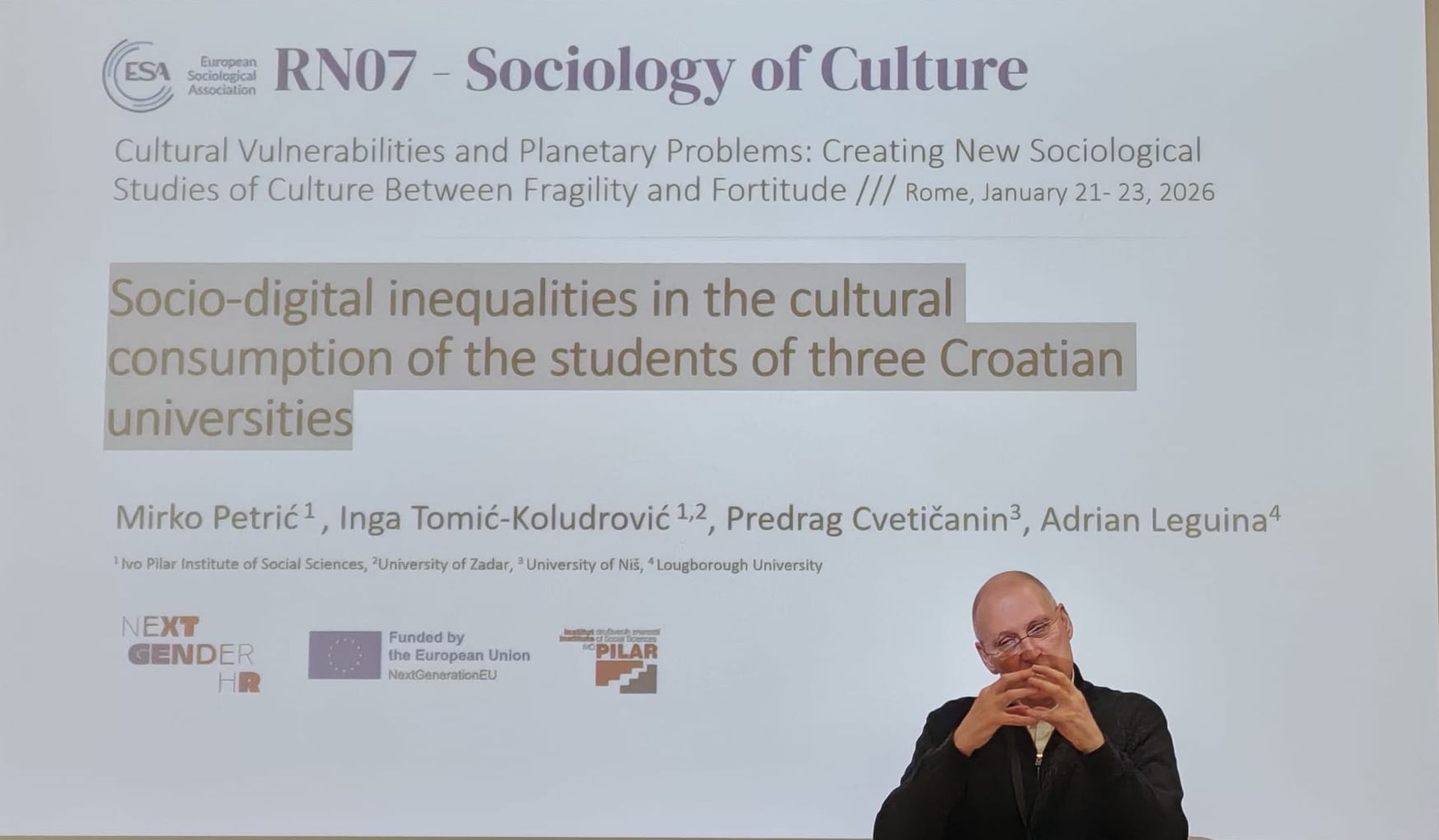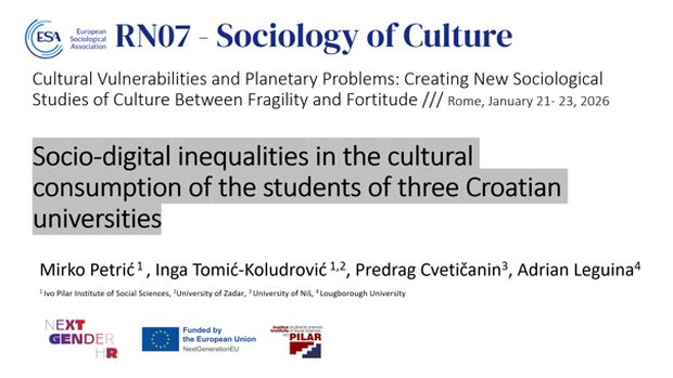 U razdoblju između 21. i 23. siječnja 2026. godine mr. sc. Mirko Petrić sudjelovao je na konferenciji istraživačke mreže za sociologiju kulture Europske sociološke asocijacije (ESA RN07, pod naslovom „Ranjivosti u kulturi i planetarni problemi: Stvaranje novih socioloških proučavanja kulture između krhkosti i unutarnje snage“ (Cultural Vulnerabilities and Planetary Problems: Creating New Sociological Studies of Culture Between Fragility and Fortitude)