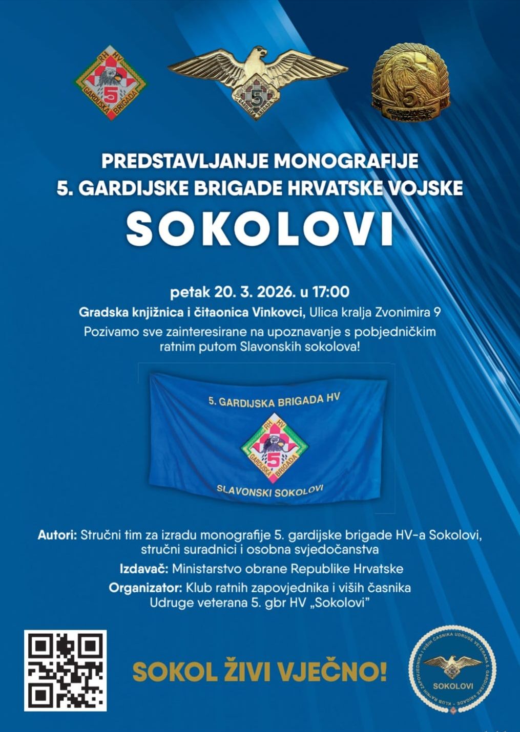 Dr. sc. Dražen Živić sudjelovao je u svečanom predstavljanju monografije 5. gardijska brigada HV “Sokolovi” održanom 20. ožujka 2026. u Gradskoj knjižnici u Vinkovcima. Organizator predstavljanja bio je Klub ratnih zapovjednika i viših časnika Udruge veterana 5. gardijske brigade “Sokolovi”