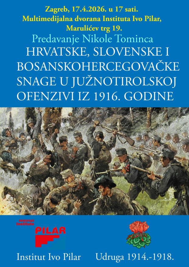 Institut društvenih znanosti Ivo Pilar i Udruga 1914. – 1918., pozivaju na predavanje Nikole Tominca pod naslovom „Hrvatske, slovenske i bosanskohercegovačke snage u Južnotirolskoj ofenzivi iz 1916. godine“