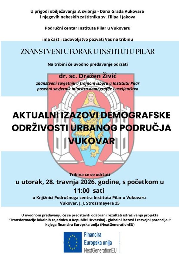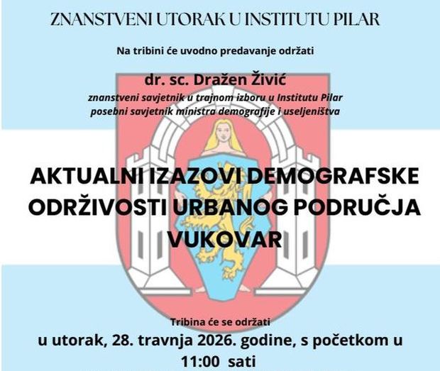 U prigodi obilježavanja 3. svibnja – Dana Grada Vukovara i njegovih nebeskih zaštitnika sv. Filipa i Jakova Područni centar Instituta Pilar u Vukovaru poziva na tribinu ZNANSTVENI UTORAK U INSTITUTU PILAR na kojoj će uvodno predavanje održati dr. sc. Dražen Živić, znanstveni savjetnik u trajnom izboru u Institutu Pilar i posebni savjetnik ministra demografije i useljeništva AKTUALNI IZAZOVI DEMOGRAFSKE ODRŽIVOSTI URBANOG PODRUČJA VUKOVAR. Tribina će se održati u utorak, 28. travnja 2026. godine, s početkom u 11:00 sati u Knjižnici Područnoga centra Instituta Pilar u Vukovaru, Vukovar, J. J. Strossmayera 25